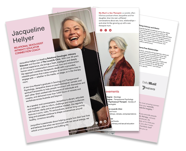 Jacqueline Hellyer is a Relational Sexologist, author, and one of Australia’s most trusted voices on sex, love and human connection.